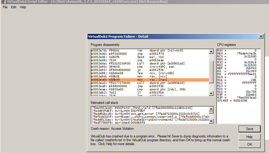 ), but they may help to show where it crashes.I've put together a zip file with four Intel ICX builds of Avisynth.dll and Avisynth.pdb. Each build comes with its corresponding PDB debug info file. Please copy both the DLL and PDB files into the System32 directory. The variants are as follows (see folder names): SSE2 SSE2 + AVX2 AVX2 AVX2 + AVX512 (for Ice Lake - 10th/11th gen i7 processors, for example) You can download them from the link (the base pack is still there). https://github.com/pinterf/AviSynthP...ag/v3.7.3.4198 Thanks. |